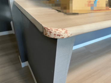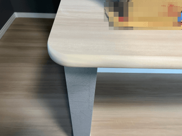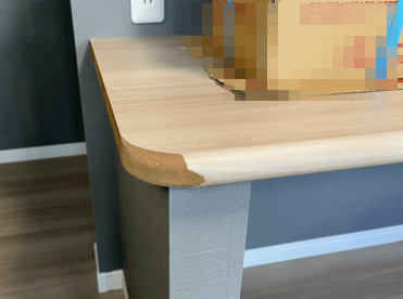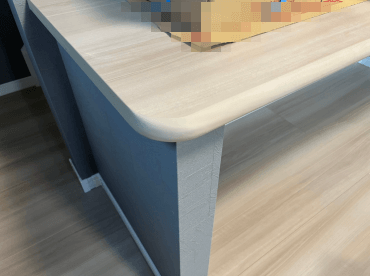 今回はハウスメーカー様より、カウンターテーブルの小口補修です。元々は角がしっかりある状態だったのですが、お客様の要望で角に丸みが欲しいということで大工さんが加工したものでした。小口を含め色が無い部分を塗装してもらいたいというご相談です。