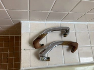 劣化や黄ばみで色ムラが目立ちます。内部手すりも錆が酷い状態です。